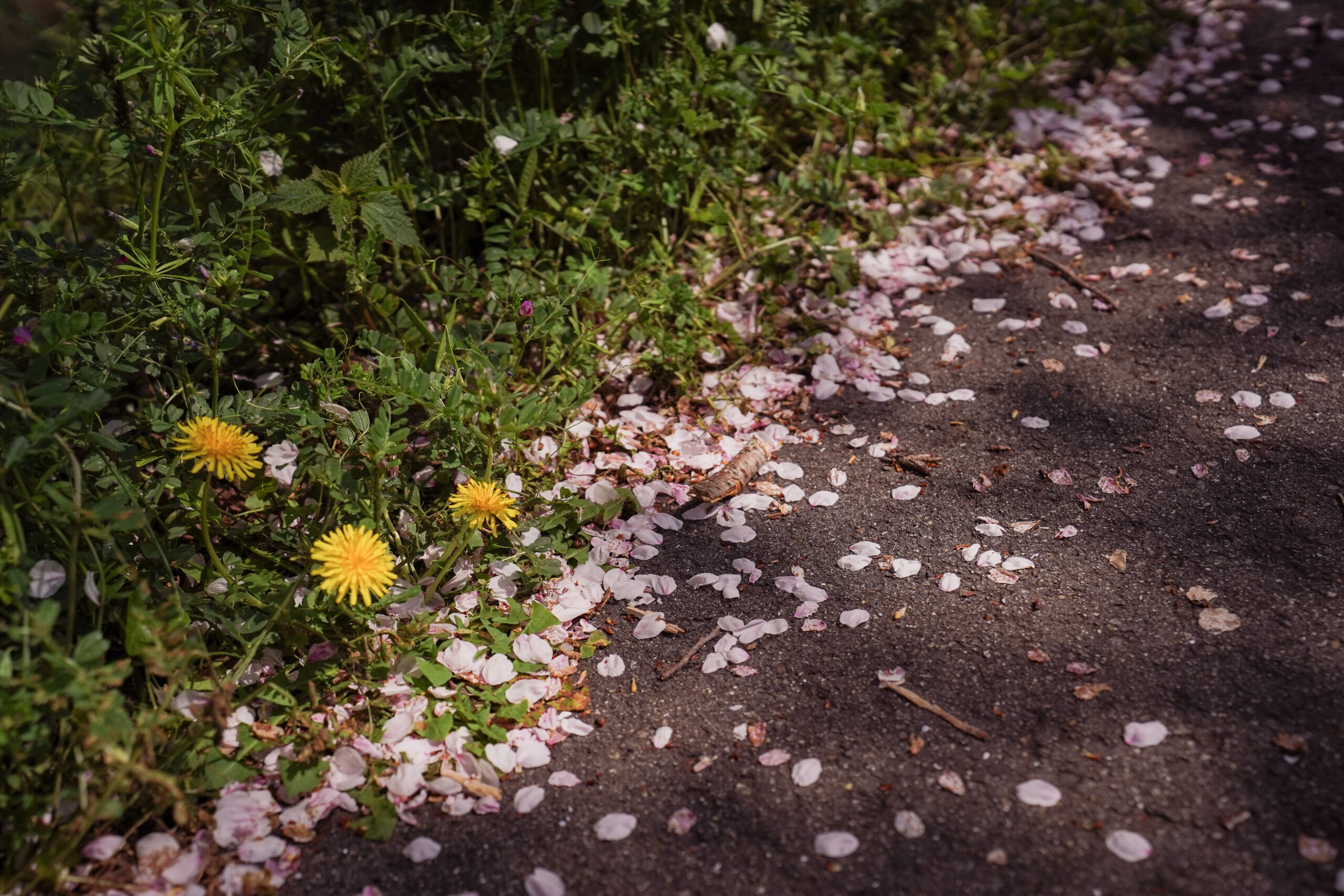 松本桜の花びらとたんぽぽの共演。春ですね