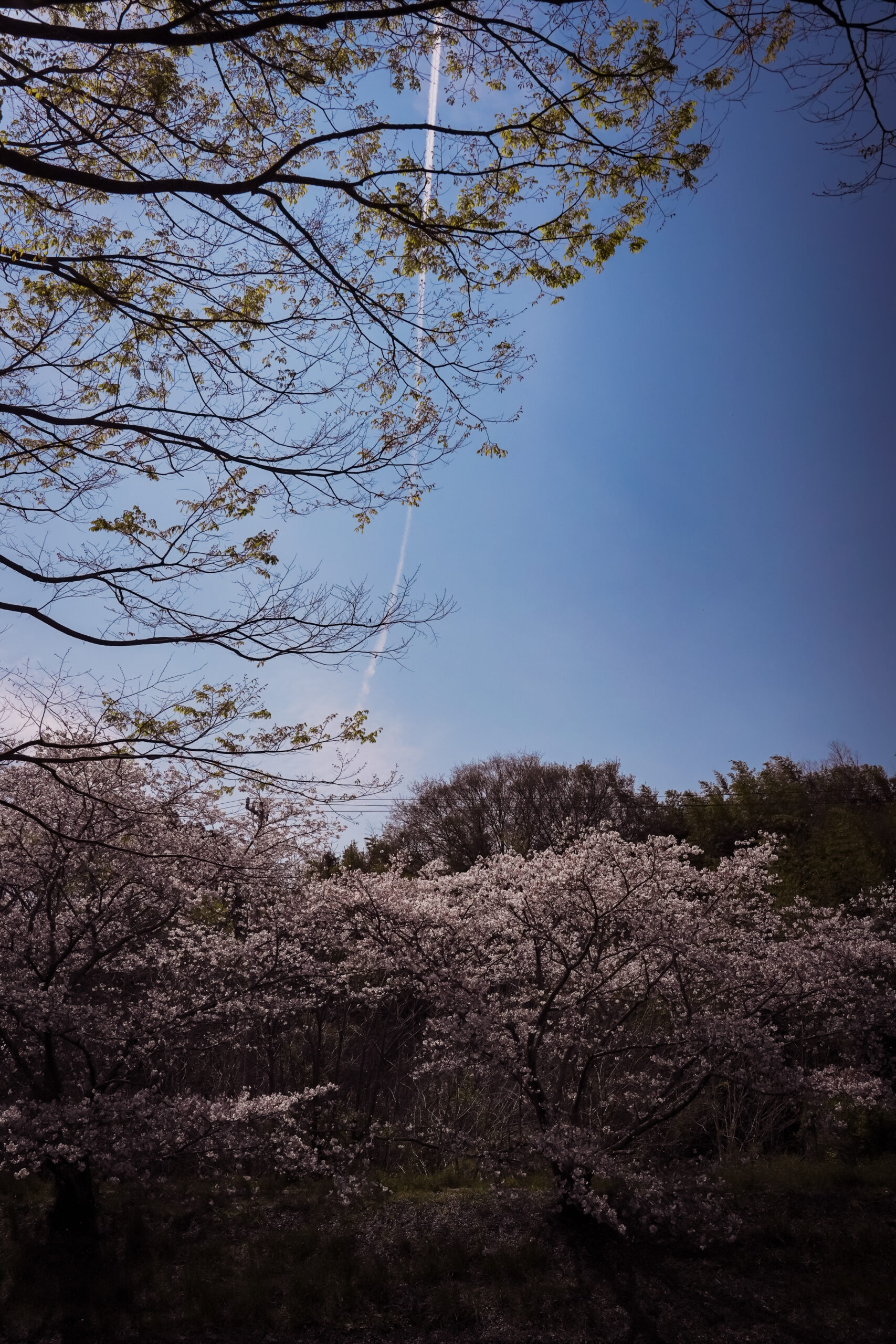 松本桜並木と飛行機雲。飛行機雲をよく目にする1日でした。