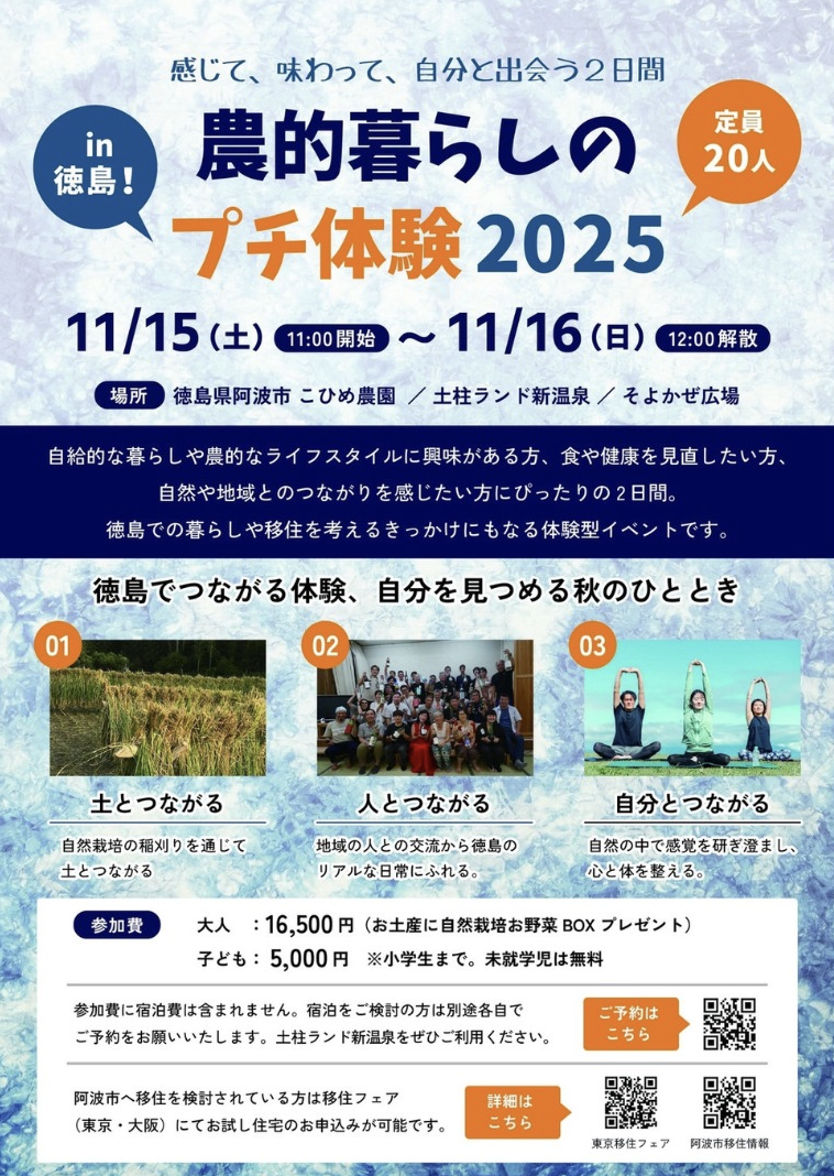 今月開催される「【PR】農的暮らしのプチ体験2025~感じて、味わって、自分と出会う2日間~に参加いたします。」イベントに、ゲストとして私が参加させていただきます。当日は、ざっくばらんなかたちで阿波市での暮らしについてお話ができればと思っております。何卒よろしくお願いします。