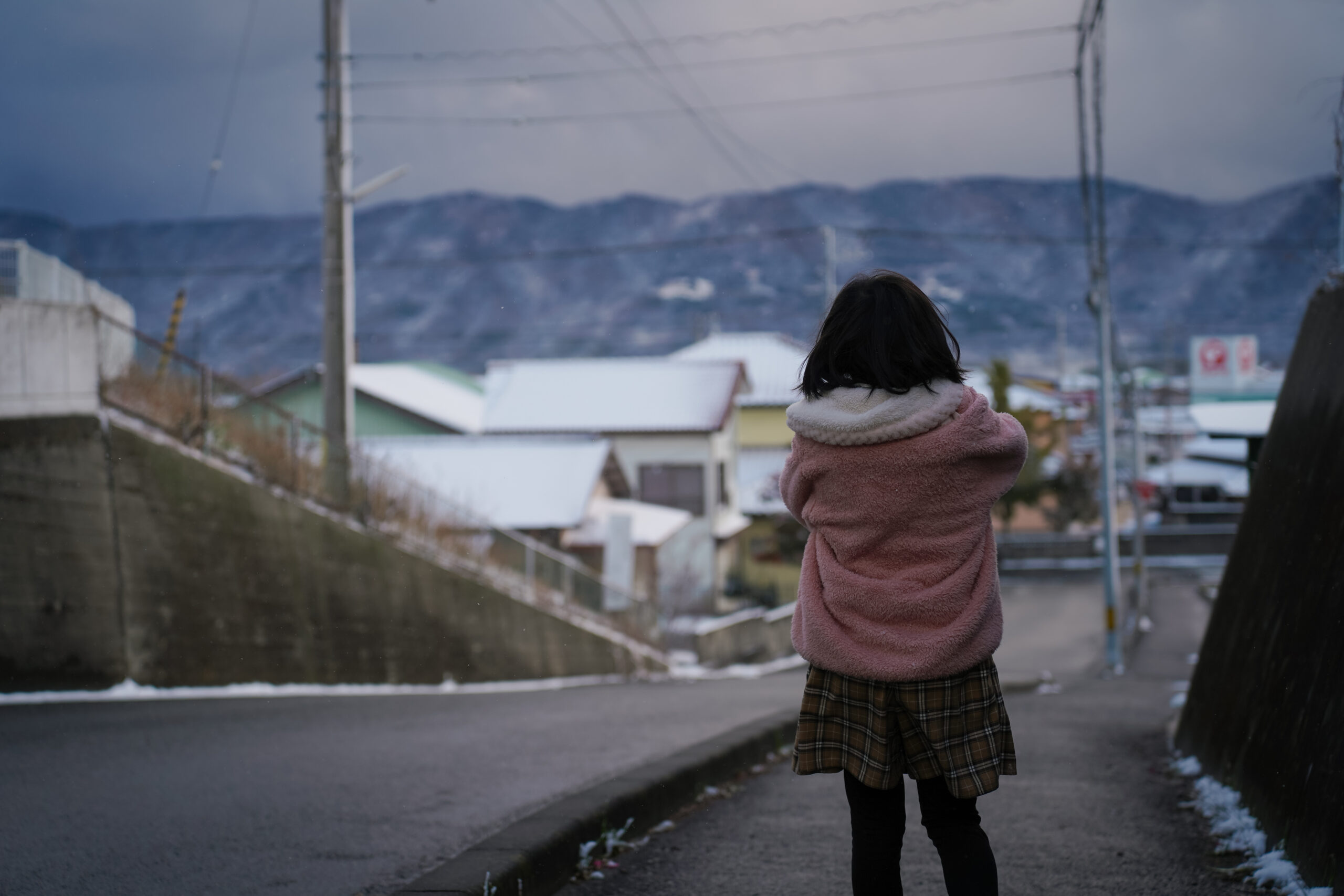 市場小学校付近の様子です。強い風は吹くたびに積もった雪が巻き上げられていました。奥に見える山間部もしっかりと雪が積もっていますね。