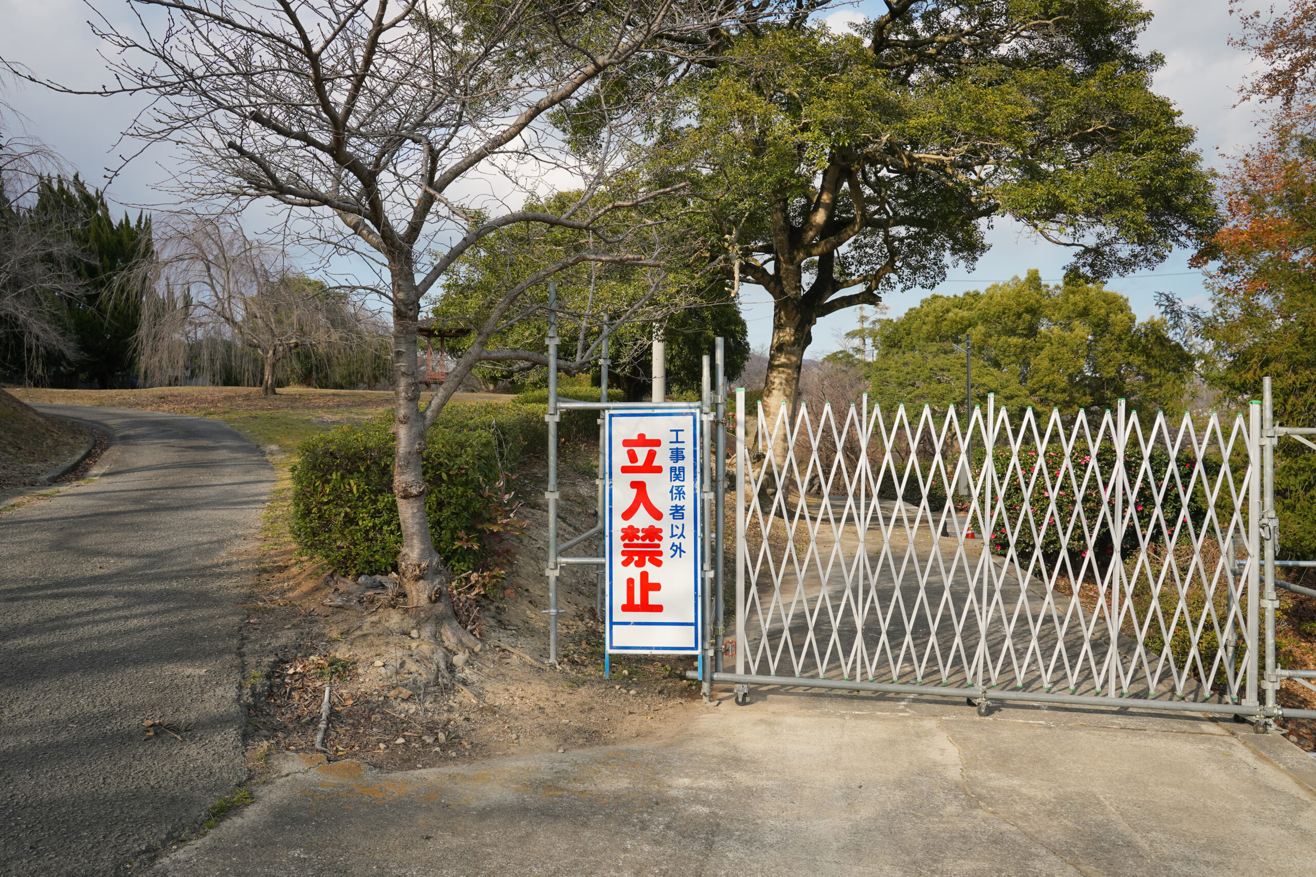 松本取り壊し工事はここ数ヶ月で行われていました。集会所付近は現在、このように立ち入り禁止の看板が設置されていて、これ以上近づくことはできないので、左手の道の上から撮影しますよ。(撮影日:2026年1月29日)